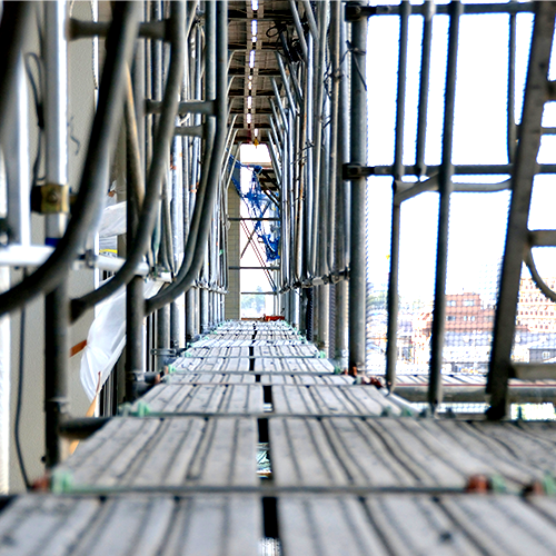 高層建築や大規模修繕に対応。広い作業空間と高い安定性で、作業効率と安全性を両立します。
